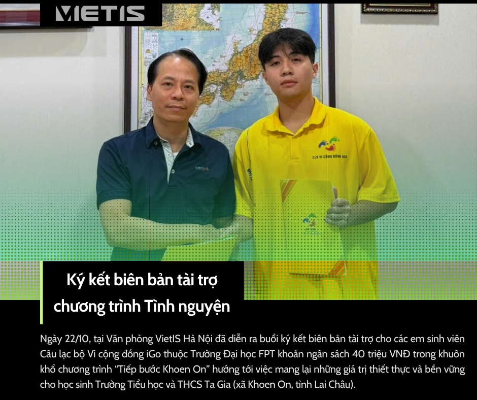 Vừa qua, Công ty VietIS đã tổ chức lễ ký kết biên bản tài trợ cho các bạn sinh viên Câu lạc bộ Vì cộng đồng iGo – Trường Đại học FPT, với khoản ngân sách 40 triệu đồng nhằm đồng hành cùng chương trình “Tiếp bước Khoen On”.Chương trình hướng tới việc mang lại những giá trị thiết thực và bền vững cho các em học sinh Trường Tiểu học và THCS Ta Gia (xã Khoen On, tỉnh Lai Châu) thông qua các hoạt động: